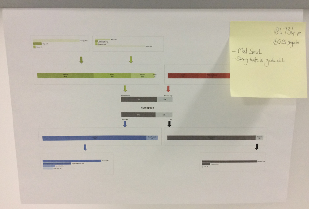The final step is to bring some focus to the journeys. Using post-it’s add detail. You could add pageviews to each A3, but pageviews are a nice to know metric not an insightful metric, however I suggest you use page value driven from site goals. If you don’t have goals set, set some! Goals I have used are people who downloaded, people who shared, people who added comments, people who signed up etc. adding page value paints a better picture of what journey provides your true users or potential users.