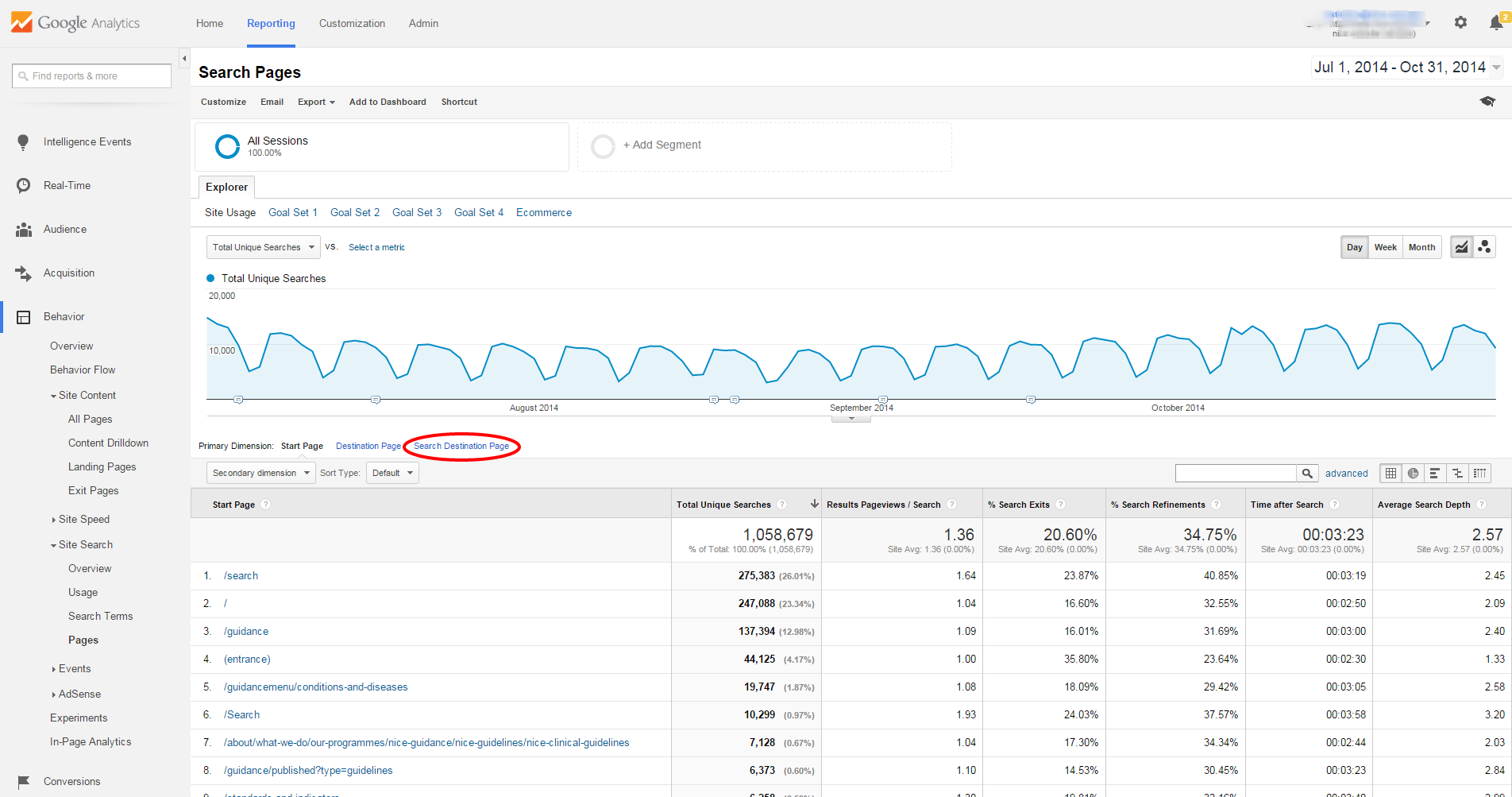 Previously we have “start page” and “destination page”, the latter being the page the results show on, which for most is the search results page. Now we have a new metric/ report which is available by locating the pages report (Behavior: Site Search: pages) and clicking the “Search Destination Page” link as the primary dimension.