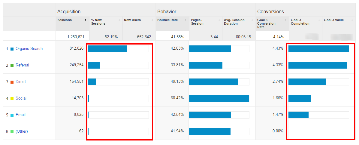 Goal data thus changes the mindset from just “users” to “real users”. We can now see what users are actually doing. For example without goal data we can see where our traffic originated from (acquisitions | overview) in terms of overall sessions. Now with goal data we can see which channels convert best to our goals as well, which in most cases is vastly different.