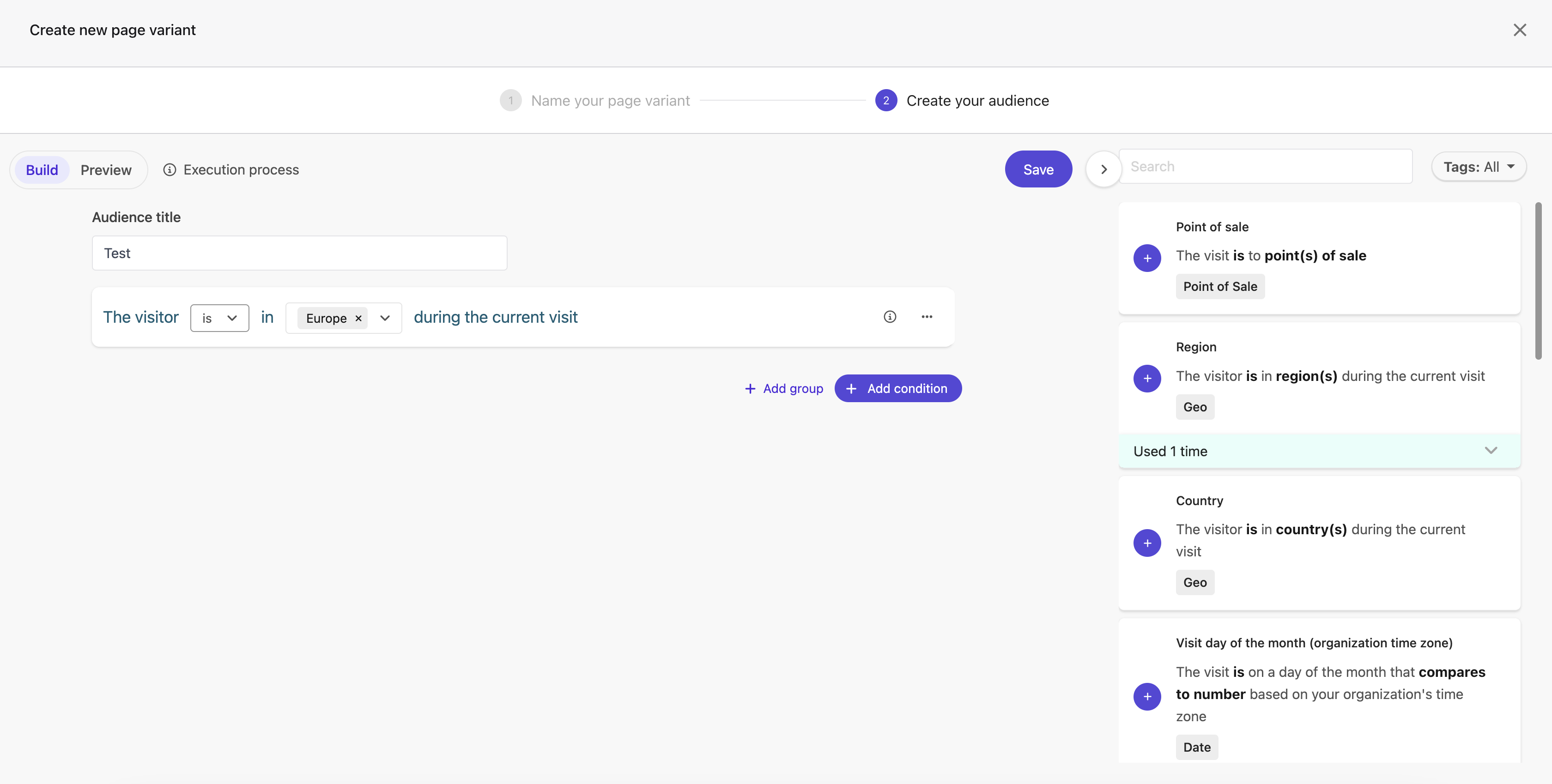 These will be the most used conditions. We know customer journeys are a combination of visits and pages over time. Patterns emerge with dead ends or fruitful paths found. These conditions are ideal in guiding users in their journey, moving them from percieved dead spots back into the flow.